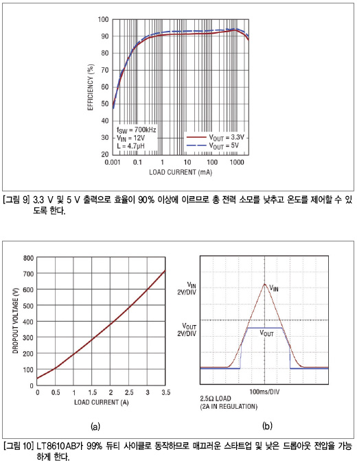 LT8610AB는 그림 9에서 보듯이 90% 이상에 달하는 효율을 달성하므로 3.3 V 및 5 V 전원을 포함한 여타 자동차 전원에 이용하기에 뛰어난 레귤레이터 솔루션을 제공한다.