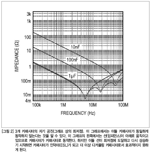 그러면 디커플링 커패시터 및 불량한 접지와 관련해서 가장 흔한 커패시터 문제로서 자기 공진(self-resonance)에 대해서 살펴볼 필요가 있다. 어떤 커패시터도 접지가 불량하면 제 역할을 할 수 없다. 커패시턴스 자기 공진은 주로 그림 1에서 보듯이 ESL(equivalent series inductance) 효과에 의해서 발생한다. 하지만 PCB via의 영향 또한 과소평가하지 말아야 한다. 무선 주파수 대에서는 이들 via가 소형 커패시터의 자기 공진 점에 영향을 미친다. 그림 2에서 1 μF 곡선에 초점을 맞춰 살펴보도록 하자.