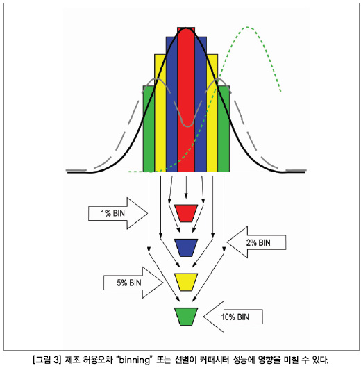 그림 2는 모든 커패시터가 동일하게 제조되는 것은 아니라는 사실을 보여준다. 전반적으로 고품질 커패시터는 반복 정밀도가 우수하지만 일부 저가 커패시터는 값이 싼 대신에 제조 허용오차가 클 수 있다. 일부 업체들은 엄격한 허용오차를 적용해서 커패시터를 “binning”(그림 3), 다시 말해 선별하고서 특별 가격으로 판매한다. 바로 이러한 커패시터를 이용해서 시스템 내의 시간이나 주파수를 설정할 때 문제의 소지가 있을 수 있다.