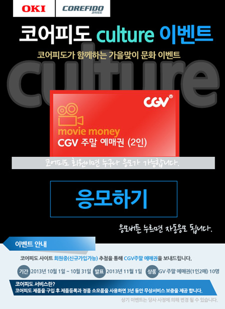오키 코어피도 홈페이지(www.corefido.co.kr)에서 진행되는 이번 이벤트는 기존 회원 및 신규 가입자 중 추첨을 통해 10명을 선정해 CGV 주말 예매권 (1인 2매)을 증정한다. 당첨자는 11월 1일에 코어피도 홈페이지를 통해 발표될 예정이다.