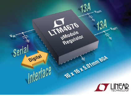 리니어는 시리얼 디지털 인터페이스를 갖춘 듀얼 13 A 또는 단일 26 A Module®(micromodule) 스텝다운 DC/DC 레귤레이터(제품명: LTM4676)를 출시했다. LTM4676은 프로토타입과 개발, 필드동작 동안 시스템 특성화, 최적화, 데이터 마이닝(data mining)을 단순화시킨다. 타깃 애플리케이션으로는 광전송 시스템과 텔레콤 스위치, 라우터, 산업용 테스트 장비, 로보틱스, RAID, 전기 유틸리티, 냉방, 유지 등의 기업 시스템 등이다.