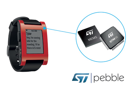 페블 스마트워치(Pebble Smartwatch)는 아이폰과 안드로이드폰에 블루투스로 연결되어 전화, 이메일 및 문자의 수신을 진동으로 알려준다. 페블 스마트워치에 내장된 STM32 F2 마이크로컨트롤러는 우수한 실시간 성능과 전력 효율성을 갖추어, 사용자에게 뛰어난 기능성과 배터리 수명을 균형있게 제공하면서 뛰어난 맞춤성의 기능 구현을 돕는다.