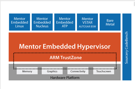 자동차 OEM 업체들과 공급업체들은 멘토 임베디드 하이퍼바이저 제품을 사용하여 이제 리눅스와 AUTOSAR(AUTomotive Open System Architecture: 자동차 시스템 개발 표준 플랫폼), 실시간 애플리케이션 및 베어 메탈 애플리케이션, 여타 시스템들을 모두 하나의 플랫폼에서 사용할 수 있게 됨으로써, 신제품 설계에 소요되는 시간을 단축시킬 수 있는 혁신적인 역량을 갖출 수 있게 되었다.