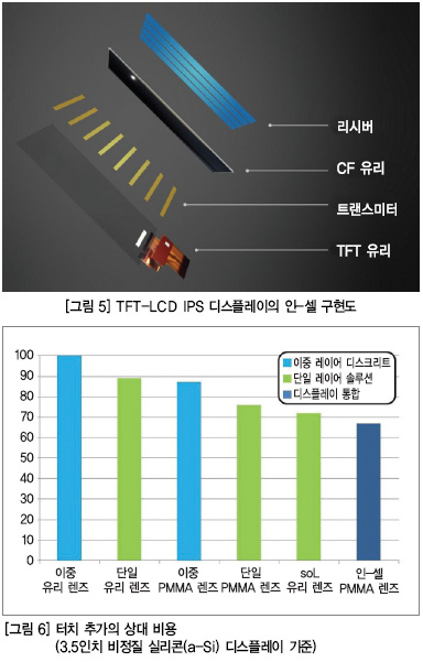그림 6의 그래프는 디스크리트 센서에서 TDDI까지 기기제조업체(OEM)의 각 터치 기술 도입에 따른 상대적인 원가 증가분을 추정한 것이다. 그림 7에 나타낸 것처럼 인-셀 에어 갭은 센서와 커버 렌즈 간에 에어 갭을 만든다. 주요 장점은 다음과 같다.