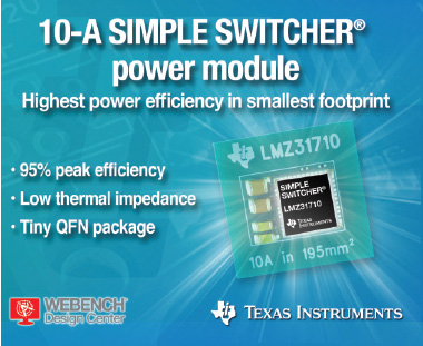 TI는 10 A LMZ31710을 포함한 심플 스위처짋 제품군의 새로운 전원 관리 모듈 3종을 출시했다. 새로운 모듈은 유사 솔루션보다 최대 50% 작아진 최소형 패키지에 높은 전력 효율을 제공한다. 또한 사용이 간편하며 산업용과 통신 인프라, 의료용, 테스트 및 측정을 비롯해 다양한 시장에서 전력 밀집 애플리케이션을 구동한다. TI의 WEBENCH짋 온라인 설계 툴과 함께 사용하면, DC/DC 변환을 간소화하고 설계 프로세스를 가속화할 수 있다.