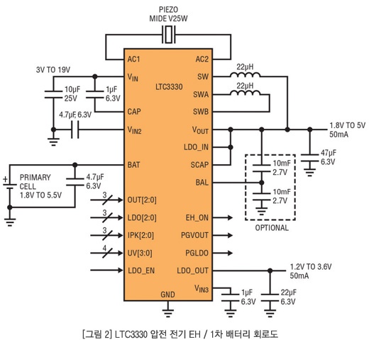 그림 2의 회로는 압전 트랜스듀서에서 발생하는 AC 입력을 사용하는 LTC3330 회로 예를 보여준다. 일반적으로 애플리케이션은 AC1의 DC 입력을 사용하며, 그리고 AC2의 2차 입력 또는 AC1 및 AC2에 걸쳐 연결된 단일 AC 입력을 사용할 수 있다. 에너지 수확 소스가 압전 트랜스듀서와 같은 AC인 경우 LTC3330은 내장된 풀 브리지 정류기를 사용하여 입력 커패시터에 DC 전압을 공급하는 반면, DC 소스는 입력 커패시터에 직접 저장된다. 입력 커패시터의 전압이 ULVO을 초과하면 LTC3330의 입력 prioritizer가 배터리를 끄고 수확된 소스에서 출력을 레귤레이트 한다. VOUT는 1.8 V ~ 5 V 사이에서 프로그래밍 가능하며, 이 출력은 주로 RF 트랜시버에 전력을 공급한다. 이 밖에 1.2 V ~ 3.3 V 사이의 저잡음 LDO 출력이 제공되며 이 출력은 코어 전력을 마이크로프로세서에 공급하는데 사용된다. 이들 두 가지 출력이 함께 결합할 때 에너지 수확 소스를 사용할 경우 최대 125 mA 출력을 공급하고, 배터리를 사용할 경우에는 50 mA를 공급한다. 에너지 수확 모드에 여분의 출력 전력이 존재할 경우 이 초과 전력은 이후의 사용을 위해 수퍼캡에 저장되므로 배터리를 더욱 절약할 수 있다. 내장된 수퍼캡 밸런서는 추가로 에너지 저장을 최적화하는데 사용할 수 있다. 에너지 수확 소스를 사용할 때 배터리는 제로 무부하 전류를 가지기 때문에 모든 배터리 에너지가 이후의 사용을 위해 저장된다는 점은 중요한 특징이다.