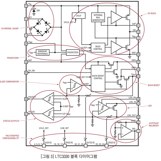 LTC3330의 에너지 수확 입력은 AC 또는 DC의 3 V ~ 19 V 전압 범위에서 동작하므로 넓은 범위의 압전, 태양광 또는 자기 에너지원에 이상적이다. 제품의 입력 저전압 록아웃 임계값 설정은 3 V ~ 18 V 사이에서 프로그래밍 가능하기 때문에 애플리케이션이 피크 전력 전환 지점에서 에너지 수확 소스에서 동작할 수 있게 한다. 그 밖에 내장된 기능으로는 프로그래밍 가능 DC/DC 및 LDO 출력 전압, 벅-부스트 피크 전류 제한, 수퍼커패시터 충전기/밸런서 및 입력 보호 션트(VIN >20 V에서 최대 25 mA) 등이 있다.