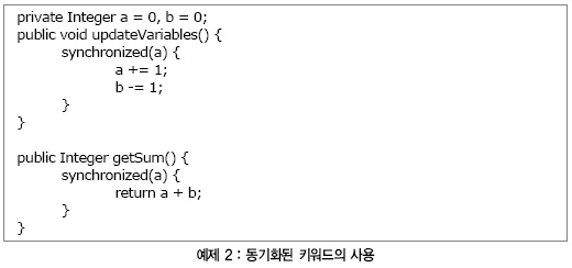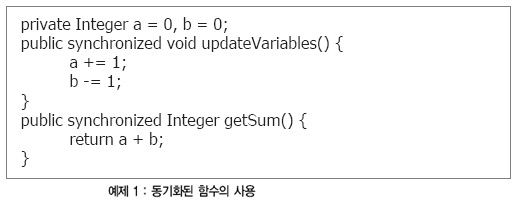 예제 1에서 동기화된 함수들은 변수 a와 b가 함께 수정되도록 사용되며, 그 결과는 동일한 합을 얻게 된다. 동기화가 없을 경우, a가 증가되었으나 b는 감소되기 전에 하나의 스레드가 코드의 updateVariables() 함수 ‘b’를 호출할 수 있다. 이 때 두 번째 스레드는 getSum() 루틴을 호출하므로 아주 잠깐이나마 합계가 달라지게 된다.