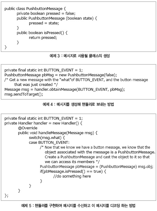 자바는 스레드 사이의 데이터나 이벤트의 안전한 전달을 위한 몇 가지 방법을 제공한다. 이러한 방법 중 하나는 핸들러(Handler)와 메시지(Message)를 이용하는 것이다. 핸들러는 우편함과 같다. 메시지를 이 우편함에 보관할 수 있으며, 관련 스레드가 한가해지는 즉시 우편함 내의 첫 번째 메시지가 스레드에 의해 처리되는 것이다. 이 방법을 이용하면 이벤트에 대한 정보나 데이터가 스레드 사이에서 안전하게 전달된다(예제 3, 4, 5).