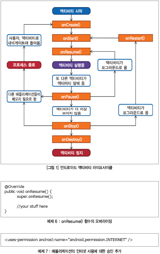안드로이드 액티비티/애플리케이션은 라이프사이클(lifecycle)이라는 다양한 트랜지션(transition)을 거친다(그림 1). 모바일/태블릿상에서 애플리케이션에 영향을 미칠 수 있는 어떤 것이 변화할 경우, 라이프사이클 트랜지션이 발생한다. 안드로이드 OS를 겨냥한 애플리케이션을 개발할 경우 액티비티 라이프사이클을 이해하는 것이 매우 중요한데, 이는 화면 회전이나 키보드의 슬라이드 아웃, 혹은 전화를 받는 것과 같은 간단한 사용자의 상호작용들이 애플리케이션에 대해 라이프사이클 변화를 야기할 수 있기 때문이다. 또한 액티비티가 요청할 수 있는 시스템 리소스 가운데 다수는 특정 라이프사이클 상태에 구애 받지 않을 것을 명시하고 있다. 예를 들어, 브로드캐스트 리시버(Broadcast receiver)는 장치 분리 등 USB 버스 상에서 일어날 수 있는 특정한 이벤트들을 감지하는 데 사용된다. 그러나 브로드캐스트 리시버는 애플리케이션이 일시 정지할 경우 등록 해제되었다가, 애플리케이션이 재개되면 다시 등록되어야 한다.