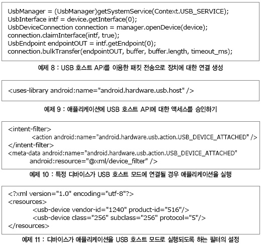안드로이드 버전 3.1 이후부터는 USB 호스트 API가 갖춰져, 이 기능을 갖춘 안드로이드 디바이스에 연결된 표준 USB 주변장치에 액세스할 수 있게 되었다. 이 OS는 또한 HID(Human Interface Device) 및 MSD(Mass Storage Device)와 같은 여러 디바이스 클래스에 대한 지원 기능도 내장하고 있다. 사용자들은 이 내장 드라이버를 통해, 일반 컴퓨터에서 사용하던 방식 그대로 USB 주변장치를 원활하게 활용할 수 있다. 지원 기능을 내장하지 않은 주변장치의 경우, USB 호스트 API는 애플리케이션 개발자가 낮은 수준의 간단한 API 집합을 통해 USB 엔드포인트(endpoint)에 연결해 직접 통신할 수 있도록 한다(예제 8).애플리케이션이 USB 호스트 API에 대한 승인을 얻기 위해서는 AndroidManafest.xml 파일의 라이브러리 이용을 선언해야 한다(예제 9).