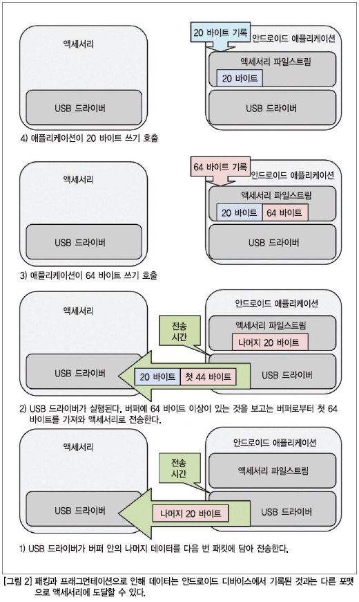 애플리케이션의 쓰기 기능에 대한 단일 호출이 다수의 USB 패킷들에 걸쳐 프래그먼테이션(fragmentation) 될 수도 있다. 안드로이드 디바이스 상의 USB 드라이버는 이 데이터를 패킷으로 쪼갠 후 이를 액세서리로 전송한다. 액세서리는 이 데이터를 원하는 포맷으로 다시 합칠 수 있어야 한다.