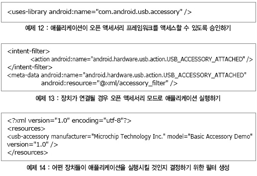USB 호스트 API와 마찬가지로, 오픈 액세서리 프레임워크를 이용하기 위해서는 AndroidManifest.xml 파일에서 승인을 받아야 한다(예제 12).
