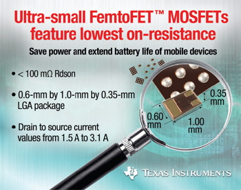 TI는 스마트폰이나 태블릿과 같이 공간 제약적인 핸드헬드 애플리케이션을 위해 낮은 온(ON) 저항을 제공하는 초소형 MOSFET을 출시했다. 새로운 FemtoFET™ MOSFET 트랜지스터 제품군은 초소형 패키징 크기에 100 mW 미만의 온 저항을 특징으로 한다. LGA(land grid array) 패키지로 제공되는 이들 3종 N채널 및 3종 P채널 FemtoFET MOSFET은 CSP(chip scale packaging) 대비 최대 40%까지 보드 공간을 줄일 수 있다. 또한 CSD17381F4와 CSD25481F4는 시중 유사 제품보다 약 70% 낮은 100 mW 미만의 온 저항을 제공한다. TI의 모든 FemtoFET MOSFET 제품은 4,000 V HBM(human body model) 이상의 ESD(electrostatic discharge) 보호 성능을 제공한다.