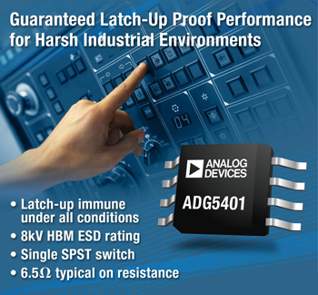 ADI의 고전압 ADG5401, ADG5421, ADG5423, ADG5419 싱글 및 듀얼 스위치가 래치-업 보호 제품군에 새롭게 추가됨으로써, 이 제품군은 이제 SPSTx1 스위치부터 32:1 멀티플렉서까지 구성할 수 있게 되었다. 래치-업이란 전원공급장치가 꺼질 때까지 의도하지 않은 고전류 상태가 지속되는 현상을 일컫는 것으로, 디바이스의 오류를 유발할 수 있다.