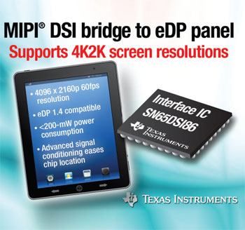 TI는 그래픽 프로세서와 임베디드 디스플레이포트(eDP) 패널 간에 MIPI DSI 브리지를 제공하는 새로운 인터페이스 IC를 출시했다. 새로운 SN65DSI86은 태블릿과 클램셸(clamshell) 노트북 및 올인원 PC의 최고 해상도인 4K2Kp60 패널의 인터페이스를 지원한다. 또한 1.5 Gbps DSI 데이터 전송률로 경쟁 제품보다 30% 높은 대역폭을 제공한다. 이 밖에도 듀얼 MIPI DSI 채널은 20% 작아진 5 mm x 5 mm 패키지에 탑재되어 PCB 공간을 절약하고 공간 제약적인 모바일 애플리케이션에 더 많은 설계 유연성을 제공한다.