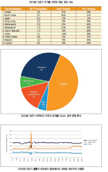 한편 아카마이 인터넷 현황 보고서는 전 세계 아카마이 인텔리전트 플랫폼(Akamai Intelligent Platform)으로부터 수집된 보고서와 정보를 활용해 매 분기 네트워크 연결성 및 접속 속도, 공격 트래픽 및 인터넷 도입, 연결 수준 등 전 세계 주요 인터넷 관련 통계들에 대한 종합적 정보를 제시하고 있다.