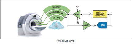 MRI에 사용되는 제어 시스템은 허용 오차가 작기 때문에 고성능 부품이 필요하다. MRI 시스템에서는 1.5 T~3 T의 주 자기장을 형성하기 위해 커다란 코일이 사용된다. 최대 1000 A의 필요 전류를 생성하기 위해서는 최대 1000 V의 높은 전압이 코일에 인가된다. MRI 시스템은 특수 코일의 전류를 변형하여 주 자기장을 선형으로 변화시키는 경사도 제어를 사용한다. 이러한 경사도 코일은 빠르고 정확하게 조절할 수 있어 신체의 작은 부위를 대상으로 주 자기장을 변형시킬 수 있다.