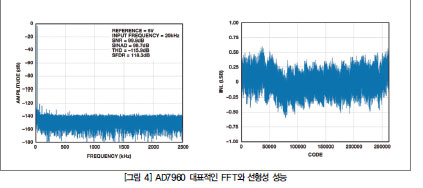 그림 3은 ±0.8 LSB 적분비선형성, ±0.5 LSB 차등비선형성, 99 dB 신호대잡음비를 특징으로 하는 고정밀, 저잡음 18비트 데이터 수집 신호 체인을 나타낸다. 그림 4는 5 V 레퍼런스 전압을 사용하는 전형적인 FFT와 선형성 성능을 보여준다. 신호 체인의 전체 소비전력은 약 345 mW로 다른 경쟁 솔루션 제품들보다 약 50 % 낮다.