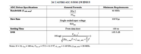 ADC의 수집 시간은 ADC 드라이버의 결정 시간 요건을 좌우한다. 표 1은 ADC 드라이버를 선택할 때 반드시 고려해야 하는 몇 가지 사양을 보여준다. 언제나 그렇듯이 신호 체인 성능은 원하는 성능을 구현할 수 있는 조건에서 확인해야 한다.
