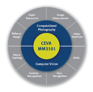 CEVA는 CEVA-CV 컴퓨터 비전의 실시간 라이브러리를 강화해 750여 가지 함수, 모바일, 자동차, 감시(Surveillance), 가전, 사물인터넷(Internet of Things) 등의 넓은 범위의 엔드 마켓(End markets)을 대상으로 프로그래밍 및 컴퓨터 비전 개발 과정 간소화를 지원한다. CEVA는 CEVA-CV 컴퓨터 비전 라이브러리에 CEVA 안드로이드 멀티미디어 프레임워크(AMF)를 확충함으로써 다양한 안드로이드 기반 애플리케이션 프로세서에 대한 CEVA-CV 함수의 통합과정을 간편하게 제공한다. 또한 CPU와 GPU의 모든 컴퓨터 비전 프로세싱을 CEVA-MM3101에서 처리해 CV 기기의 성능을 한층 향상했을 뿐만 아니라 전력 소비를 절감할 수 있다. 이번 CEVA-CV에 추가된 신규 기능은 해리스 코너(Harris Corner)와 허프 변환(Hough Transform), 일체형 합계(Integral Sum), 패스트(Fast), LBP, 서프(SURF), 호그(HOG), SVM, ORB 탐지와 매칭 같은 특징 탐지 커널과 대상 인식 알고리듬을 포함한다. 해당 기능은 스마트폰, 태블릿, 웨어러블 기기, 내추럴 사용자 인터페이스(NUI: Natural User Interface), 감시 그리고 운전자보조지원시스템(ADAS: Advanced Driver Assistance Systems)에 사용되는 증강 현실(Augmented reality) 애플리케이션에 주로 사용된다.