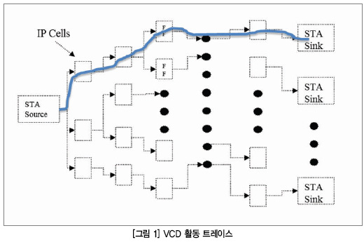 그림 3은 활동 스위트에 포함될 게이트들을 무작위적으로 선택하는 간단한 벡터리스 모드의 구현을 보여준다. 적색 선들은 이 활동 스위트에 포함된 게이트들을 나타낸다. 보다시피, 실제 회로 동작과의 상관관계는 대단치 않다. 활동 스위트에 관계 없는 STA 경로의 부분 path들이나 게이트들이 포함되어 있기 때문이다. 실제 회로 동작에서 게이트 트리거링이 일어날 가능성은 관계 없는 게이트들보다는 팬아웃 게이트의 경우가 보다 높다.