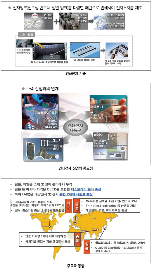 정부는 반도체와 디스플레이 등 전자부품의 제조공정을 전자잉크로 인쇄하는 방식으로 대체할 수 있는 인쇄전자산업을 육성한다는 방침이다. 따라서 앞으로 웨어러블 스마트 디바이스와 플렉서블 디스플레이, 사물 인터넷 등의 제품에 응용되어 부가가치 창출이 기대된다.