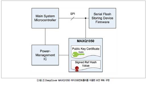 바로 이 같은 보안 부트를 실행할 수 있는 마이크로컨트롤러가 최근에 출시되었다. 이 보안 마이크로컨트롤러는 위에서 열거한 모든 요구를 충족한다. 그림 2는 DeepCover MAXQ1050 마이크로컨트롤러를 이용함으로써 다양한 임베디드 장비로 보안 부트를 구현할 수 있다는 것을 보여준다.
