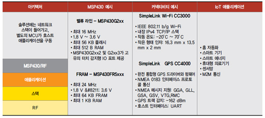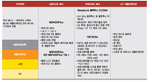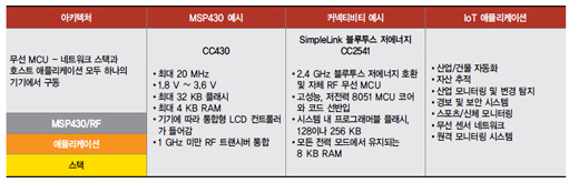 초저전력 MSP430 MCU는 네 가지 커넥티비티 아키텍처에서 작동하도록 설계됐다. 아래 표에서도 볼 수 있듯이 첫 번째 아키텍처는 네트워크 스택과 호스트 애플리케이션을 하나의 칩으로 구동하는 무선 MCU 솔루션이다. 이 아키텍처에 잘 맞는 무선 MCU의 좋은 예가 TI의 CC430 제품군이다.