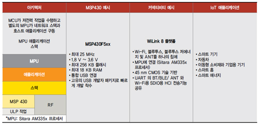 마지막 커넥티비티 아키텍처로 TI의 WiLink™ 8 콤보 연결 솔루션 같은 무선 연결 솔루션은 TI의 Sitara™ AM335x 프로세서(이 프로세서는 호스트 애플리케이션, Wi-Fi, 블루투스 네트워크 스택을 구동) 같은 마이크로프로세서(MPU)에 연결된다. 여기에는 별도의 MCU가 특정 저전력 작업을 실행한다(센서 허브 등). 이 조합에서 MSP430 MCU는 사용자 입력을 모니터링하여 가속도계 움직임을 기록해 데이터를 전송해야 하는지 등의 시점을 결정하는 ‘항시 대기’ 프로세서 기능을 한다.