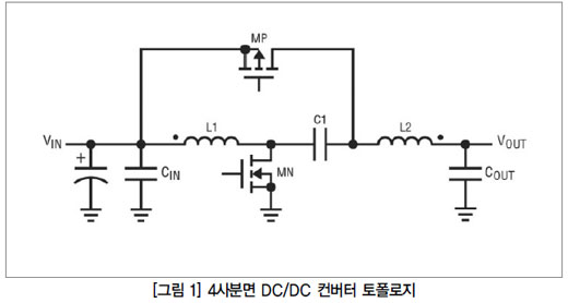 그림 1은 이 4사분면 컨버터의 기본적인 회로 및 구성요소들을 보여준다. MFET, MN, PFET, MP가 상호 다른 위상(out of phase) 및 고정 스위칭 주파수로 동작한다. 전류 모드 제어(이 그림에서는 표시하지 않음)를 이용해서 필요에 따라서 MN의 듀티 사이클을 변경할 수 있다.