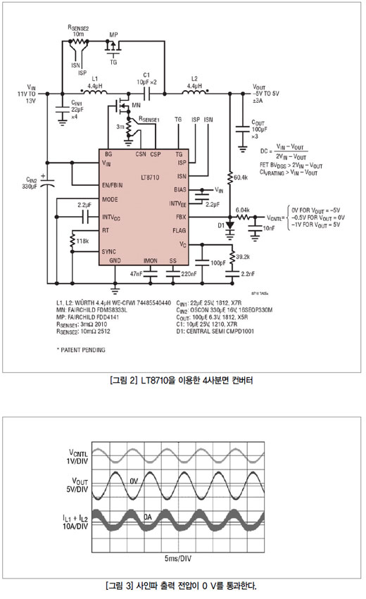 LT8710을 이용한 4사분면 DC/DC 컨버터 토폴로지는 양의 및 음의 출력 전압과 또한 양의 및 음의 출력 전류를 발생시킬 수 있는 강력한 회로를 제공한다. 출력과 직렬로 연결된 인덕터(그림 2에서 L2)가 출력 전압 리플을 낮추도록 한다. 또한 이 경우에는 듀티 사이클이 50퍼센트에 가까우므로 접지에 가까운 출력 전압을 발생시키는 것을 간소화한다. FPGA 바디 바이어싱, DC 모터 드라이브, 써모일렉트릭 쿨러(thermoelectric cooler), 오디오 드라이버, 그 외의 다양한 애플리케이션에 이 회로를 활용할 수 있다.