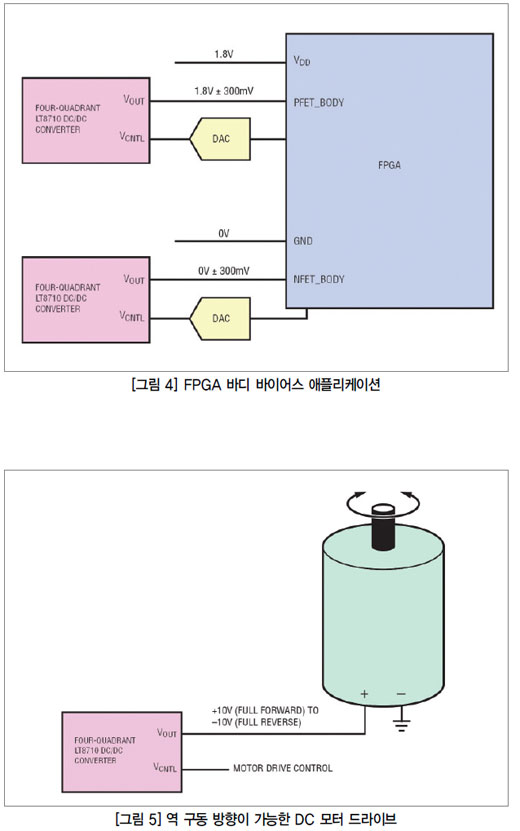 또한 H-브리지 기법은 4개의 스위칭 소자와 좀 더 복잡한 제어 체계가 필요하다. 어떤 부하는 음의 단자를 접지와 비교해서 상대적으로 높게 바이어싱할 수 없다. FPGA 역 바이어싱 애플리케이션이 바로 그 같은 경우이다. 또 다른 전통적인 방법은 양의 전원 레일과 음의 전원 레일의 2개 전원 레일을 구축하는 것이다. 이 방법은 접지보다 낮아질 수 있는 바이폴라 전압 동작을 달성하기 위해 레귤레이션을 이용하면서 양의 또는 음의 레일로 전환하기 위해 다양한 회로를 이용한다. 그럼으로써 결과적으로 매우 복잡한 시스템을 발생시키고 통상적으로 효율이 떨어지며 출력 전압이 접지 전위를 통과할 때 비선형적 응답을 발생한다.
