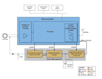 시스템 패키지(SiP, system-in-a-package) 솔루션은 웨이크업 및 위치 인식 RF 커넥티비티를 통합해 소형 배터리를 사용한 매우 작은 크기의 컴팩트한 설계가 가능하다.