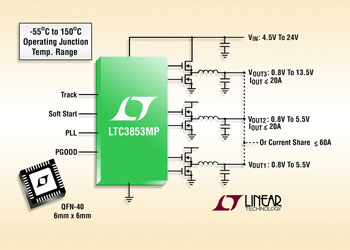 리니어 테크놀로지 코리아(대표 홍사곽)는 트리플 출력 동기식 스텝다운 스위칭 레귤레이터 H 및 MP 등급 버전(제품명: LTC3853)을 출시했다고 밝혔다. 이 디바이스는 4.5V ~ 24V 입력 전압 범위에서 동작하며, 최대 95% 효율로 0.8V ~ 13.5V 범위의 출력 전압을 제공하며 위상 당 최고 20A의 출력 전류를 생성할 수 있다. 이러한 H 및 MP 등급 버전은 각각 –40°C ~ 150°C 및 –55°C ~ 150°C의 동작 접합 온도 범위에서 동작할 수 있도록 보장한다.