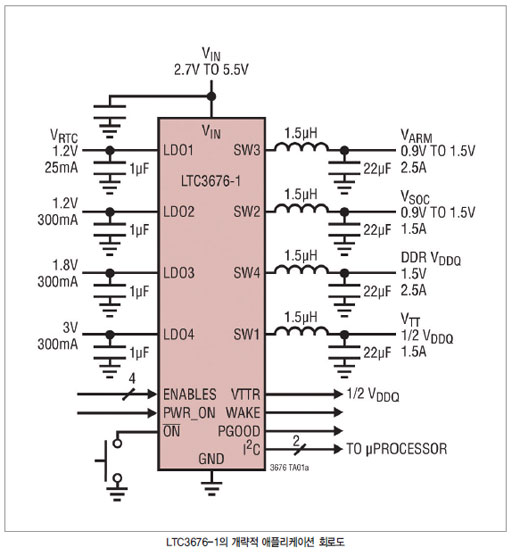 LTC3676/-1은 프리스케일의 i.MX6 프로세서와 ARM 기반 프로세서, 기타 첨단 휴대기기 마이크로프로세서 시스템에 이용하기 위한 포괄적인 전원 관리 솔루션이다. LTC3676/-1은 코어, 메모리, I/O, 시스템온칩(SoC) 레일에 이용하도록 각기 최대 2.5 A를 공급하는 4개의 동기식 스텝다운 DC/DC 컨버터와 저잡음 아날로그 전원에 이용하기 위한 3개의 300 mA 선형 레귤레이터를 포함한다.