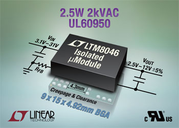 리니어는 9 mm x 15 mm x 4.92 mm BGA 패키지에서 2kVAC 갈바닉 절연(3kVDC로 생산 테스트 적용)으로 2.5 W 출력 DC/DC μModule®(마이크로모듈) 컨버터(제품명: LTM8046)를 출시했다.
