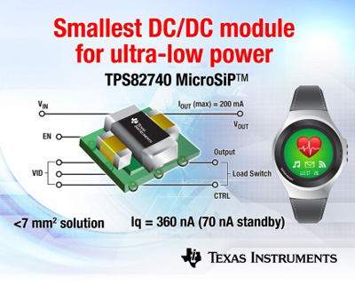 TI의 새로운 TPS82740A 및 TPS82740B 스텝 다운 컨버터 모듈은 95% 변환 효율로 200mA 출력 전류를 지원하고, 활성화 상태에서는 단 360nA만을, 대기 상태에서는 70nA 대기 전류만을 소비한다. 이 초소형 모듈은 스위칭 레귤레이터, 인덕터, 입/출력 커패시터를 완전 통합한 9범프 MicroSiP 패키지로 제공되며, 단 6.7mm2의 솔루션 크기가 가능하다.