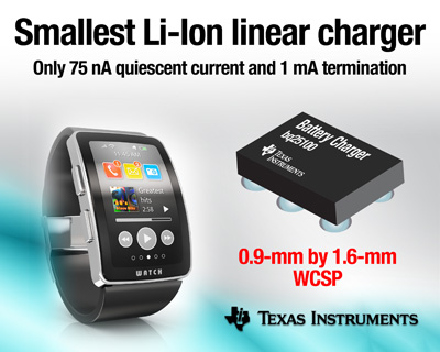 새로운 bq25100 단일 셀 리튬 이온 충전기는 0.9mm x 1.6mm WCSP 패키지로 제공되며 기존 충전기 솔루션의 절반 크기에 불과하다. 이 디바이스는 최대 30V 입력 전압을 지원하고 최저 10mA, 최고 250mA의 고속 충전 전류를 정확히 제어하며, 최저 1mA까지의 정밀한 충전 종료가 가능해 초소형 리튬 이온 코인 배터리를 지원할 수 있다. 또한, bq25100은 75nA 미만의 누설 전류를 지원할 수 있어 대기 동작을 연장해준다.