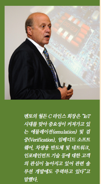 한국 멘토그래픽스는 지난 8월 개최된 ‘Mentor Forum 2014’에서 IoT(사물 인터넷) 시대를 맞아 반도체 보안을 위한 EDA 솔루션의 역할을 강조했다. 이날 방한한 멘토그래픽스의 월든 C 라인스 회장은 “기존의 반도체 및 전자 등의 산업을 비롯하여 첨단 스마트 전자제품 및 첨단 모바일 기기 및 자동차 시장에 대한 공략을 가속화할 것”이라고 밝혔다.