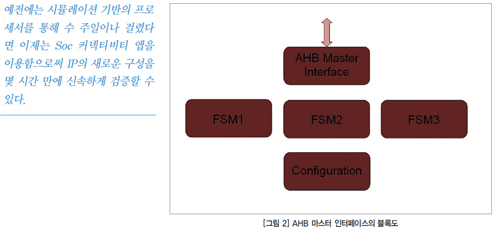 우리 칩의 일부 주변장치는 공통의 슬레이브 인터페이스 외에도 AMBA 마스터 인터페이스를 갖추고 있다. 검증 문제를 더욱 까다롭게 만드는 것은 이러한 마스터들에 DMA 컨트롤러가 두 개 이상 내장할 수 있다는 점이다. 그림 2는 검증된 AHB 마스터 인터페이스의 간략한 블록도이다. AHB 트랜잭션을 생성할 수 있는 세 개의 FSM으로 구성되는데, 이 트랜잭션은 AHB 슬레이브 인터페이스를 통해 접근할 수 있는 레지스터들로 설정할 수 있다. 이 블록도는 전체 IP로부터 추출됐으며 일부 설정은 assume 구성체를 통해 제약을 받는다.