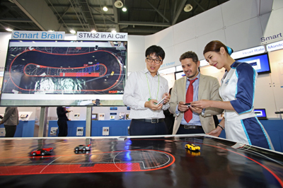 스마트 브레인 존에서는 최고 성능을 자랑하는 ST의 최신 STM32 마이크로컨트롤러 시리즈인 STM32 F7을 집중 조명하며, STM32 F4와 F7 칩의 성능 차이를 보여주는 벤치마크 시연이 함께 이루어질 예정이다. 올해 초 선보인 STM32 큐브MX(STM32 CubeMX) 소프트웨어 플랫폼을 이용해 손쉽게 코드를 생성해보는 전용 섹션도 마련됐다. 이 소프트웨어 툴은 STM32 마이크로컨트롤러를 이용한 개발을 보다 손쉽고 빠르며 접근 가능하게 만들어 준다. 인공지능 레이싱 카 게임인 앙키 드라이브(Anki Drive)도 직접 즐길 수 있다. STM32F0 마이크로컨트롤러를 탑재한 미니 카들이 경주 트랙에서 전송되는 데이터를 효율적으로 처리하여 실시간 대응을 하는 방식으로 운영되는 게임이다.