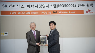 SK하이닉스(대표:박성욱, www.skhynix.com)가 17일(金), 국제 표준 인증기관인 BSI Group Korea(영국표준협회)로부터 ‘에너지경영시스템 – ISO50001’ 인증을 획득했다고 밝혔다. 이 날 이천 본사에서 열린 인증 수여식에는 SK하이닉스 김동균 환경안전본부장과 BSI Group Korea 천정기 회장 등이 참석했다.