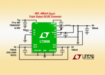 LT3668은 60V까지 과도상태를 보호하며4.3V ~ 40V의 VIN 범위에서 동작하는 특성으로 자동차 및 산업용 애플리케이션에 이상적이다. 이 제품의 내부 600mA 스위치는 최고 400mA까지 제공할 수 있으며, 1차 출력의 혼합 부하와 트랙킹 LDO 두 개 모두에 배전된다. 1차 스위칭 채널은 1.2V로 낮은 출력을 제공할 수 있으며, 각 LDO는 1.1V로 낮은 출력을 제공할 수 있다. LT3668은 3개의 모든 채널이 조절될 때, 대기 전류가 50µA에 불과하며, 항상 전원이 켜져야 하는(always-on) 자동차 애플리케이션에 이상적이다.