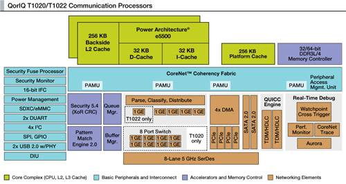프리스케일의 코어아이큐(QorIQ) T1 제품군 프로세서는 1 ~ 4개 코어를 통합하며 5 ~ 8Gbps IP 포워딩에 있어 낮은 전력 범위로, 비용 효율적인 패키징을 통해 비슷한 등급의 기존 장치보다 2 ~ 4배 더 높은 성능을 제공하도록 설계된다. 이러한 코어아이큐(QorIQ) T1 시리즈 멀티코어는 1G, 2.5G, 5G 및 10G 인터페이스 지원 옵션을 제공하며, 또한 기업과 무선 고객이 요구하는 더 높은 대역폭의 암호화된 터널을 구현하는 검증된 프로토콜 오프로드 엔진도 제공한다.