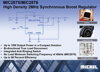 마이크렐 코리아(대표이사 오영준, www.micrel.com), 고성능 리니어 및 전력 솔루션을 비롯해 LAN, 타이밍 및 통신 솔루션 분야의 업계 선도주자인 마이크렐은 3개의 초소형 외부 컴포넌트만을 필요로 하고, 보드공간은 불과 122mm2만을 차지하는 최고 2A 출력 성능을 갖춘 2종의 2MHz 부스트 컨버터, MIC2875/MIC2876을 공급한다고 밝혔다. 이러한 초소형의 고효율(최고 95%) 레귤레이터는 싱글 셀 리튬이온 배터리로 동작하거나 USB OTG(On-The-Go) 및 HDMI 호스트, 태블릿, 스마트폰과 같은 애플리케이션에 전원을 공급하는데 이상적이다.