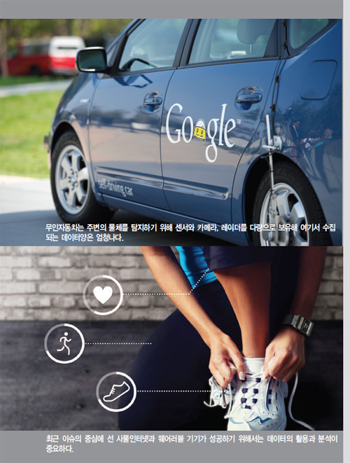 최근 이슈의 중심에 선 사물인터넷과 웨어러블 기기가 성공하기 위해서는 데이터의 활용과 분석이 중요하다. 앞으로 사물인터넷과 웨어러블 기기가 더 많이 활용될수록 많은 양의 데이터가 발생 및 수집되고 이 데이터의 분석을 통해 새로운 제품이 늘어날 전망이다. 특히 무인자동차는 주변의 물체를 탐지하기 위해 센서와 카메라, 레이더를 다량으로 보유해 여기서 수집되는 데이터양은 엄청날 것으로 전망된다.