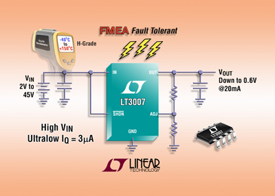 LT3007의 핀아웃은 FMEA (Failure Mode Effects Analysis)를 준수하여, 출력은 인접 핀 단락되었거나 핀이 부동상태로 남겨질 경우 레귤레이션 전압 또는 그 이하가 된다. 이 디바이스의 3µA 대기 및 셧다운 전류(1µA 미만)는 초저 대기 전력 소모를 실현시켜, 셧다운을 요구하지 않는 애플리케이션에 이상적이거나 원격 모니터링 및 동작 시간 연장을 위해 필요한 “킵 얼라이브” 시스템을 위해 저전류 배터리 구동 메모리와 같은 현대식 출력 구동 성능과 고입력 전압이 필요한 애플리케이션에 이상적이다.