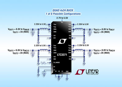 LTC3371의 벅 전력단은 각각의 VIN 및 SW 핀을 간단히 결합하고 C1-C3핀에서 원하는 구성을 프로그래밍하여 병렬식으로 연결될 수 있다. 최고 4개의 인접한 전력단이 단일 채널에서 결합될 수 있으며, 쿼드 2A 벅에서 듀얼 4A 벅까지 8개의 독자적인 출력 구성의 결과를 제공할 수 있다. 단일 인덕터는 각각의 벅 레귤레이터에 대해 사용될 수 있으며, 사용되지 않은 전력단은 전반적인 효율 향상을 위해 고전력 채널 중 하나에 추가될 수 있다.