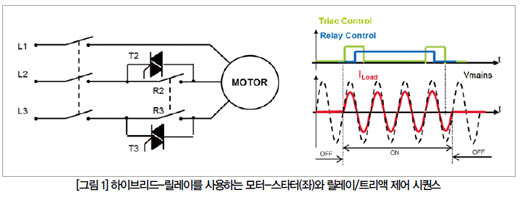 또 다른 솔루션은 2개의 기술을 모두 활용해 1개의 반도체 릴레이(solid-state relay)와 전기기계식 릴레이를 병렬로 연결한 하이브리드 릴레이(Hybrid Relay, HR)을 구현한다. 그림 1은 모터-스타터 애플리케이션에 사용된 이와 같은 토폴로지를 나타낸 것이다. 이 3상 모터-스타터를 위해 여기에 단지 2개의 하이브리드 릴레이가 사용된다. 2개의 릴레이가 모두 OFF 상태가 되면, 중성선(neutral wire)이 단선되지 않는 한 모터가 오프-상태로 유지된다.